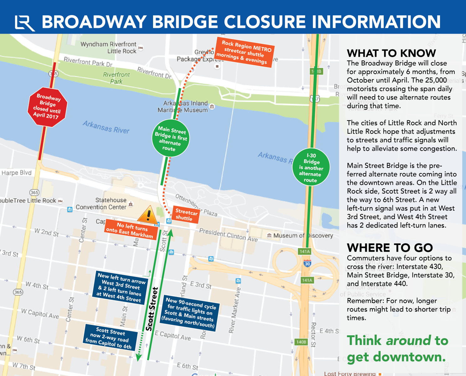 The City of Little Rock’s Public Works Department has been preparing for the bridge closure for months and will begin implementing changes to mitigate traffic issues. Those include: